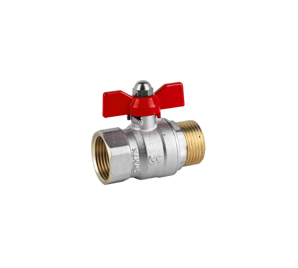 Kuglasta slavina sa leptir ručkom PN25, navojna. Sa muško-ženskim priključcima. Pun protok. Temperatura 150C. Dostupna i sa crvenom ručkom.